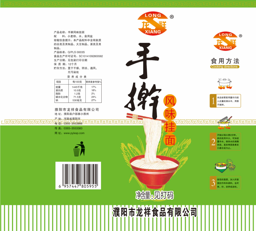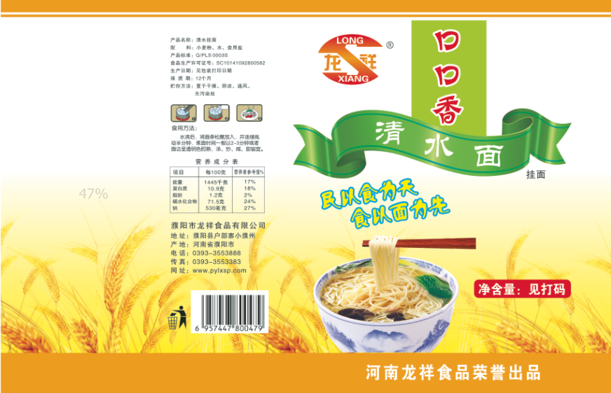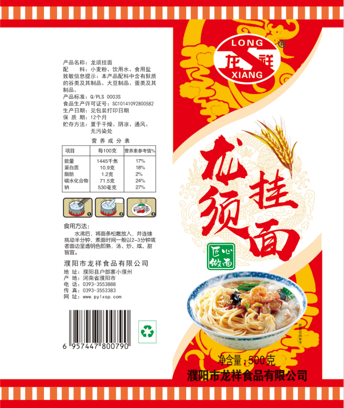 濮陽市龍祥食品有限公司位于河南省濮陽縣戶部寨鎮(zhèn)小濮州,始建于1994年,前期投資200萬元,經(jīng)過幾年的努力,大力開發(fā)市場,由于市場的需求量急劇上升,出現(xiàn)供不應(yīng)求,于2004年擴(kuò)建,建成一座新型的現(xiàn)代化面粉加工企業(yè),并擁有全國先進(jìn)全自動(dòng)生產(chǎn)設(shè)備一套,產(chǎn)量由以前的100噸/天,提高到現(xiàn)在400噸/天。 2012年再次擴(kuò)大規(guī)模申請為濮陽市龍祥食品有限公司,注冊資金500萬元。2012年又投資800萬元新建掛面生產(chǎn)線一條,日產(chǎn)掛面50噸。龍祥食品有限公司現(xiàn)有職工120余人,總工程師1人,專業(yè)技術(shù)人員10人,經(jīng)濟(jì)師1人,會(huì)計(jì)師1人,銷售人員2人,優(yōu)秀專業(yè)人員20余人。  龍祥公司自創(chuàng)建以來,社會(huì)效益十分可觀。公司一直以“今天的質(zhì)量,明天的市場”為信念,“一切為了客戶需求,竭誠追求完美品質(zhì)”為企業(yè)宗旨,走專業(yè)化經(jīng)營和職業(yè)化管理的路子。